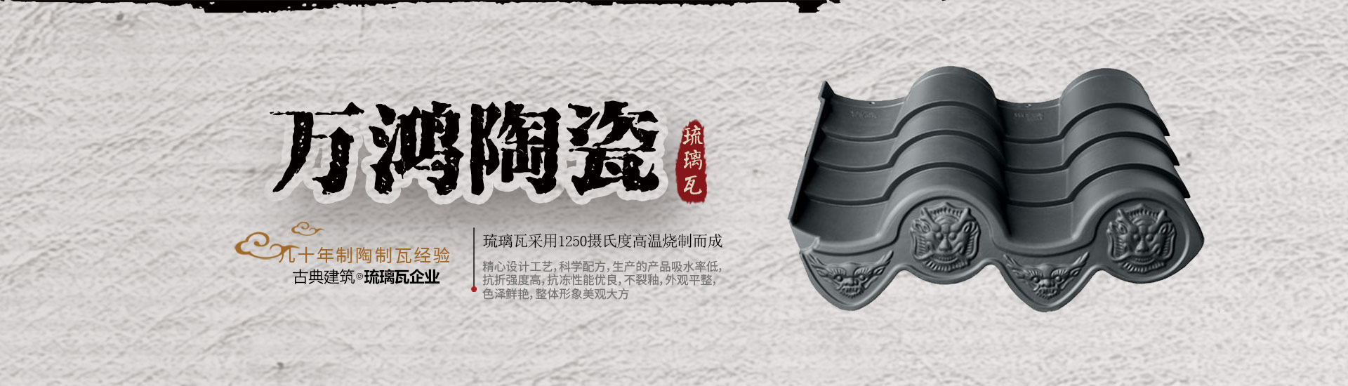 宜興市萬(wàn)鴻陶瓷有限公司是國(guó)內(nèi)生產(chǎn)古建琉璃瓦企業(yè),也是宜興市琉璃瓦行業(yè)龍頭骨干企業(yè)。琉璃瓦采用1250攝氏度高溫?zé)贫?,公司座落?jīng)濟(jì)發(fā)達(dá)的宜興市丁山鎮(zhèn),臨近寧杭高速公路、新長(zhǎng)鐵路、錫宜高速和104國(guó)道,交通十分便利?! ∪f(wàn)鴻陶瓷擁有幾十...